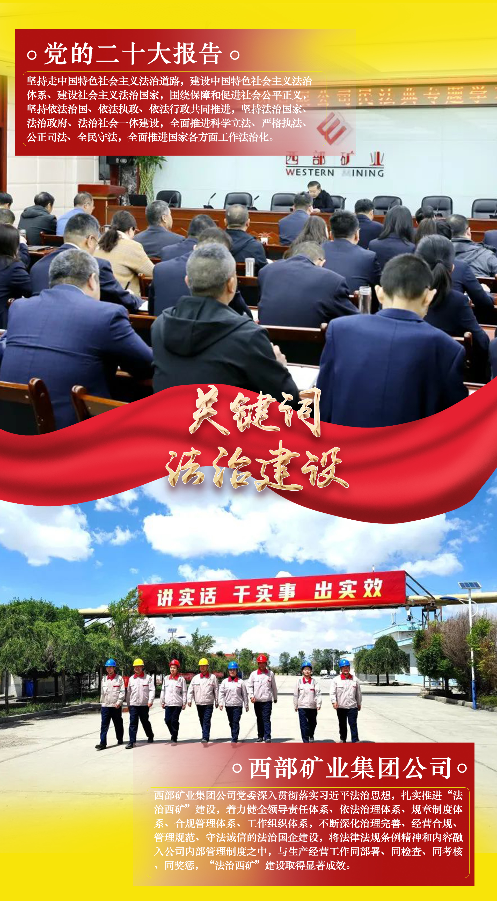 把藍圖變為現實,是一場新的長征。黨的二十大報告是全面建設社會主義現代化國家新征程上的宣言書、動員令、集結號。細讀報告中的這些“關鍵詞”,無不說到了西礦人的心坎上,更加堅定了推動公司高質量發展行穩致遠的信心與決心,紛紛表示要切實把思想和行動統一到黨的二十大精神上來,錨定黨的二十大關鍵詞,擼起袖子加油干,用新的偉大奮斗創造新的偉業,為全面建設社會主義現代化國家、全面推進中華民族偉大復興貢獻西礦力量。本期專欄,用一組海報分享西礦人眼中的“二十大關鍵詞”。