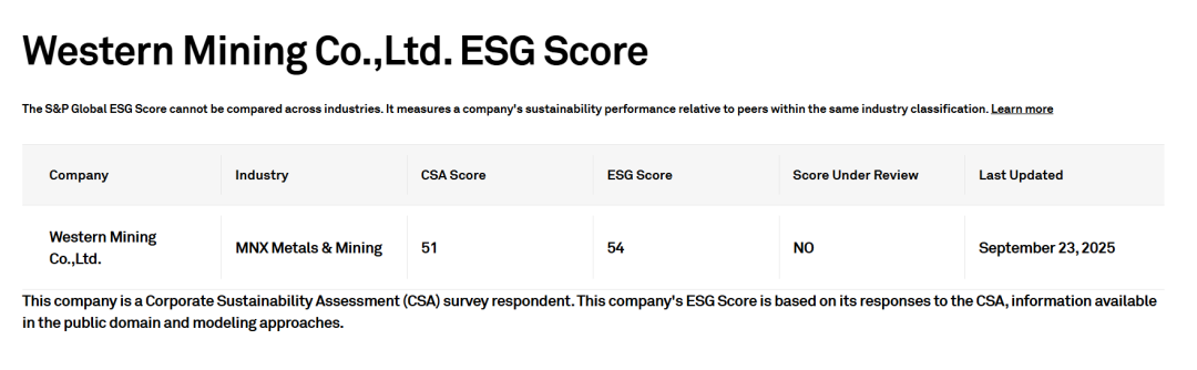 董事會事務部訊??近日,全球最主要的評級公司標普全球更新ESG評分,西部礦業得分名列前茅,持續升高至54分(CSA Score 51,ESG Score 54),超越全球84%礦業企業。今年4月,公司還憑借在環境、社會及公司治理(ESG)方面的杰出表現成功入選《可持續發展年鑒(中國版)2025》。